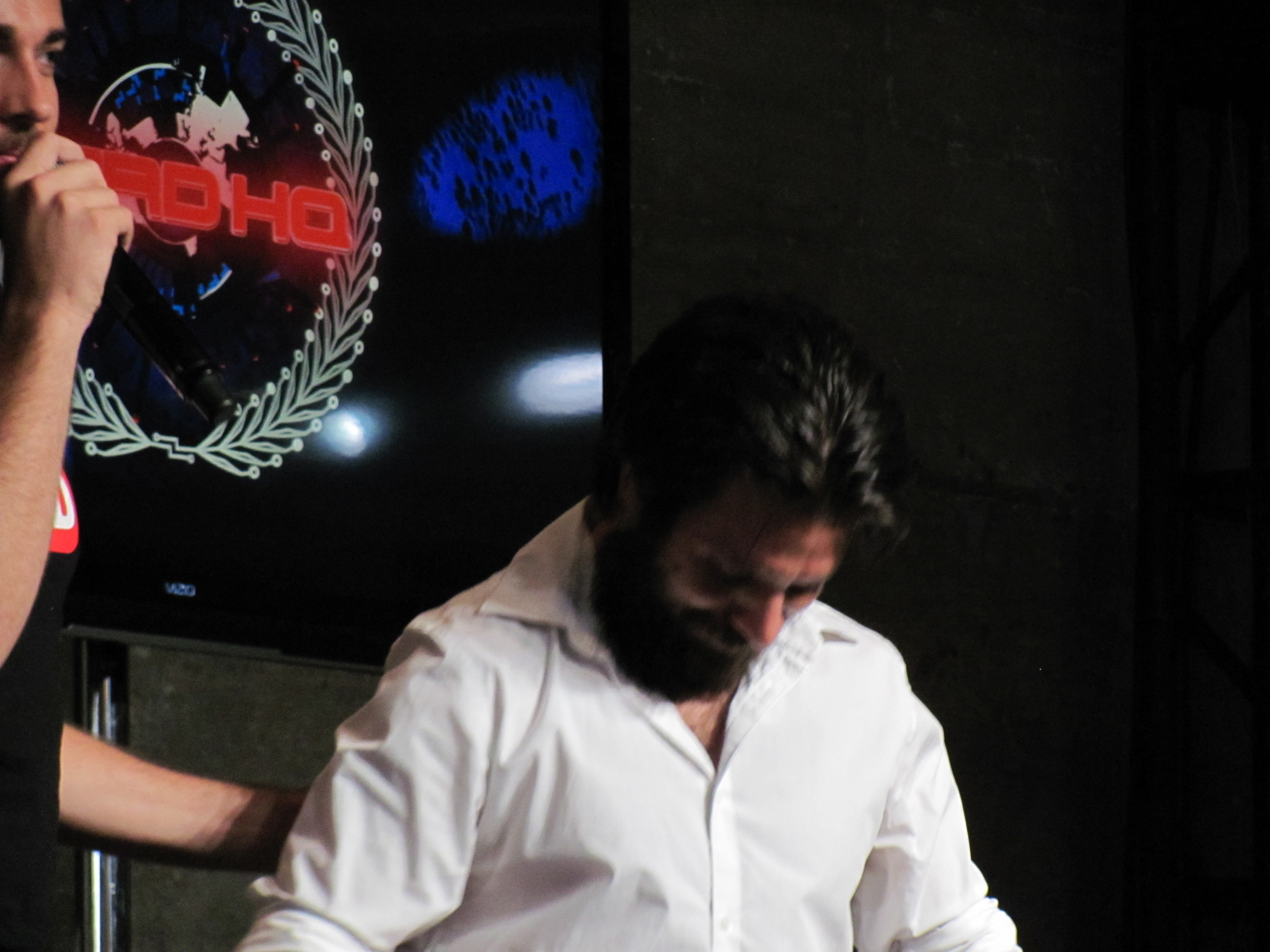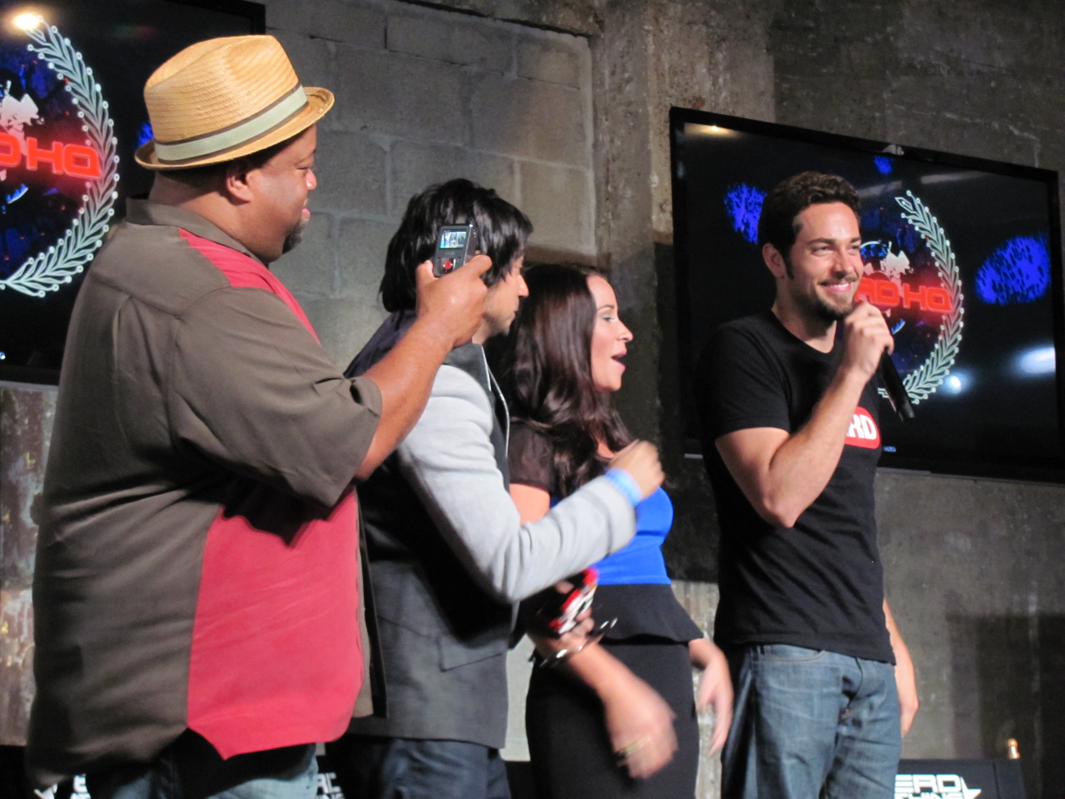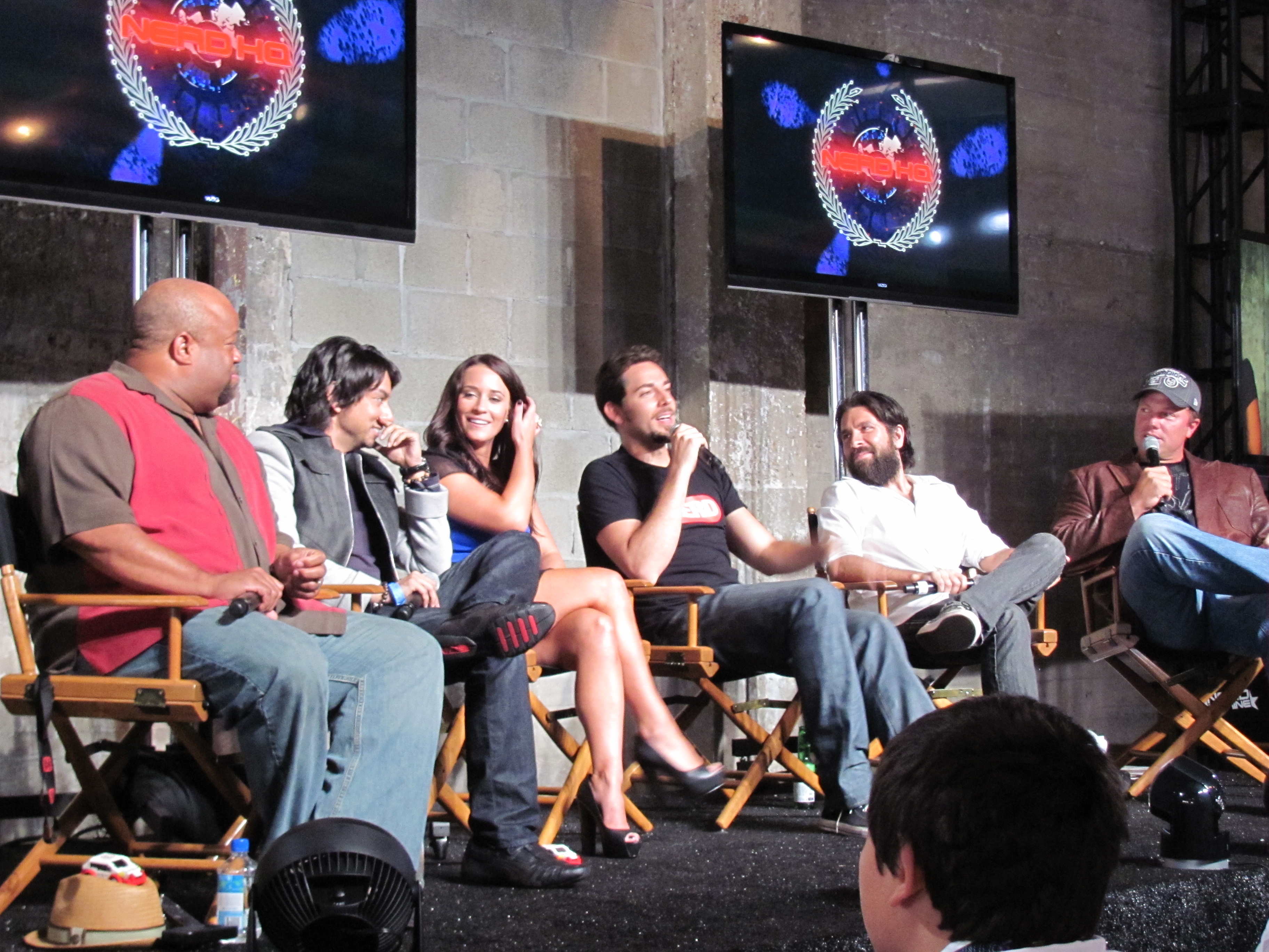 The panel included Mark Christopher Lawrence, Vik Sahay, McKenna Melvin, Zachary Levi, a mountain man beard (I believe Josh Gomez was under it), and Adam Baldwin. The first panel also had Yvonne Strahovski, but she had to dash off to press events for Dexter, so she wasn’t on the second panel. However, she was walking out of Nerd HQ as we were going in, so we did get a brief glimpse of her and an earful of her amazing accent.